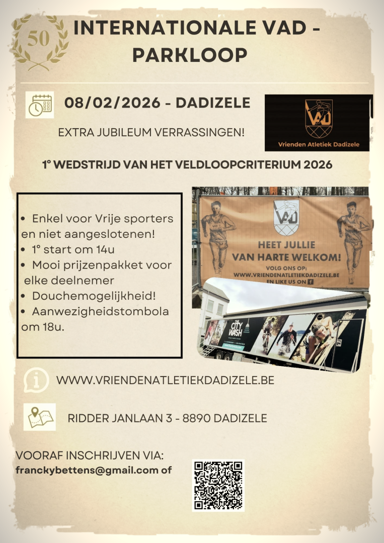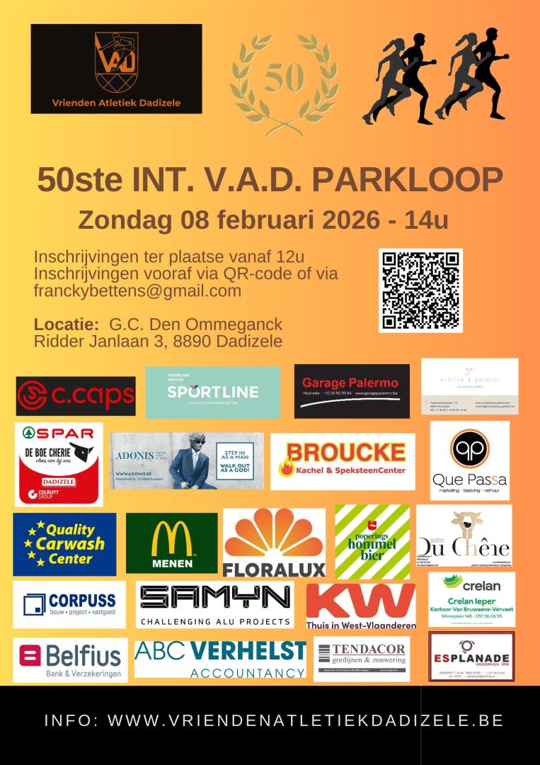 Nog een kleine 4 maanden te gaan... maar de voorbereidingen zijn al volop bezig! Op zondag 8 februari 2026 organiseren wij onze 50ste editie van de V.A.D.- Parkloop in Dadizele. De Vrienden Atletiek Dadizele blaast op 1 februari 2026 precies 50 kaarsjes uit en de week erna presenteren wij voor de 50ste maal de V.A.D.- Parkloop, een jubileumeditie met extra verrassingen! 1 zaak mag ik alvast verklappen: het wordt een 'RETRO' editie met o.m. voor de grote ronde een passage door de weide, waar in een ver verleden altijd de start en aankomstplaats lag. Dus voor de atleten of toeschouwers die houden van een stukje 'nostalgie': WEES ER ZEKER BIJ!