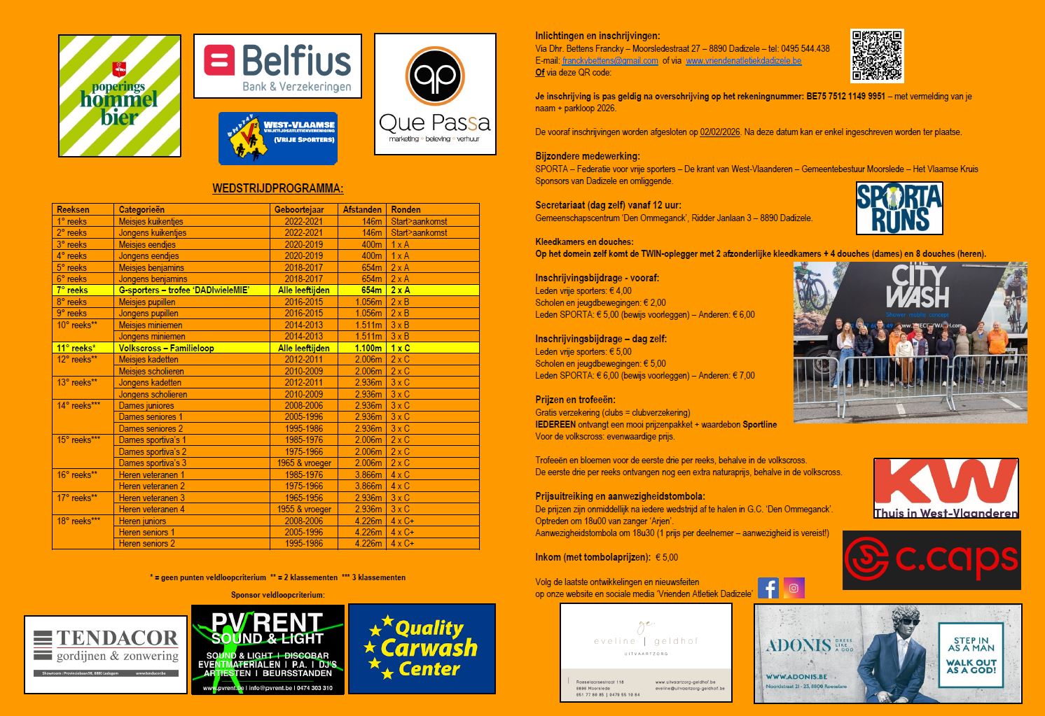 In bijlage de wedstrijdfolder met alle praktische info over onze 49ste stratenloop 'Dwars door Dadizele' van vrijdag 19 september 2025 op een totaal nieuw parcours!